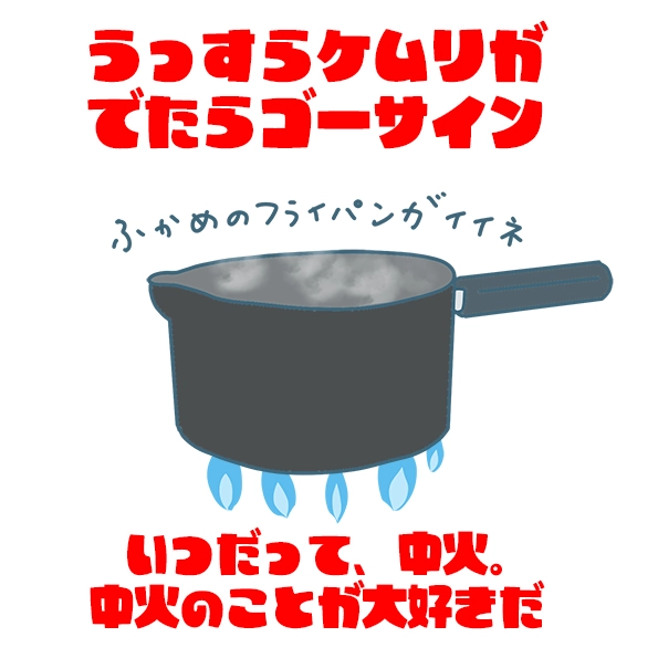 どんな料理でもそうだと思うんだけど、フライパンは良く熱してから具材を入れるのが良いと思う