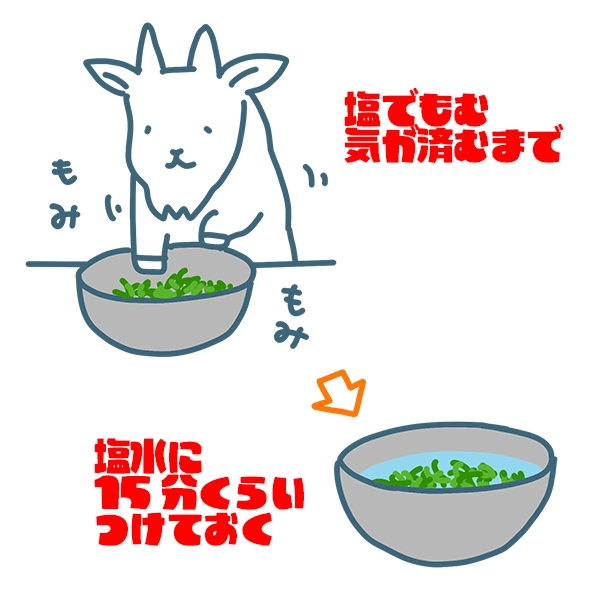 塩もみしたあとに塩水に浸しておくまではチャンプルーと一緒で、そのあとサッと30秒くらい?ゆでる