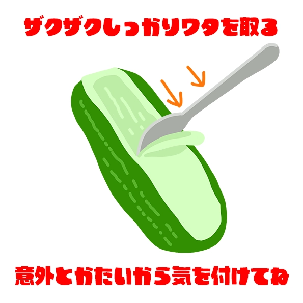 ゴーヤは白いワタが苦いのを知っているので、スプーンでゴリゴリ、きれいにほじくる。きれいに取れると気持ちもきれいになる気がするので丁寧にとる。